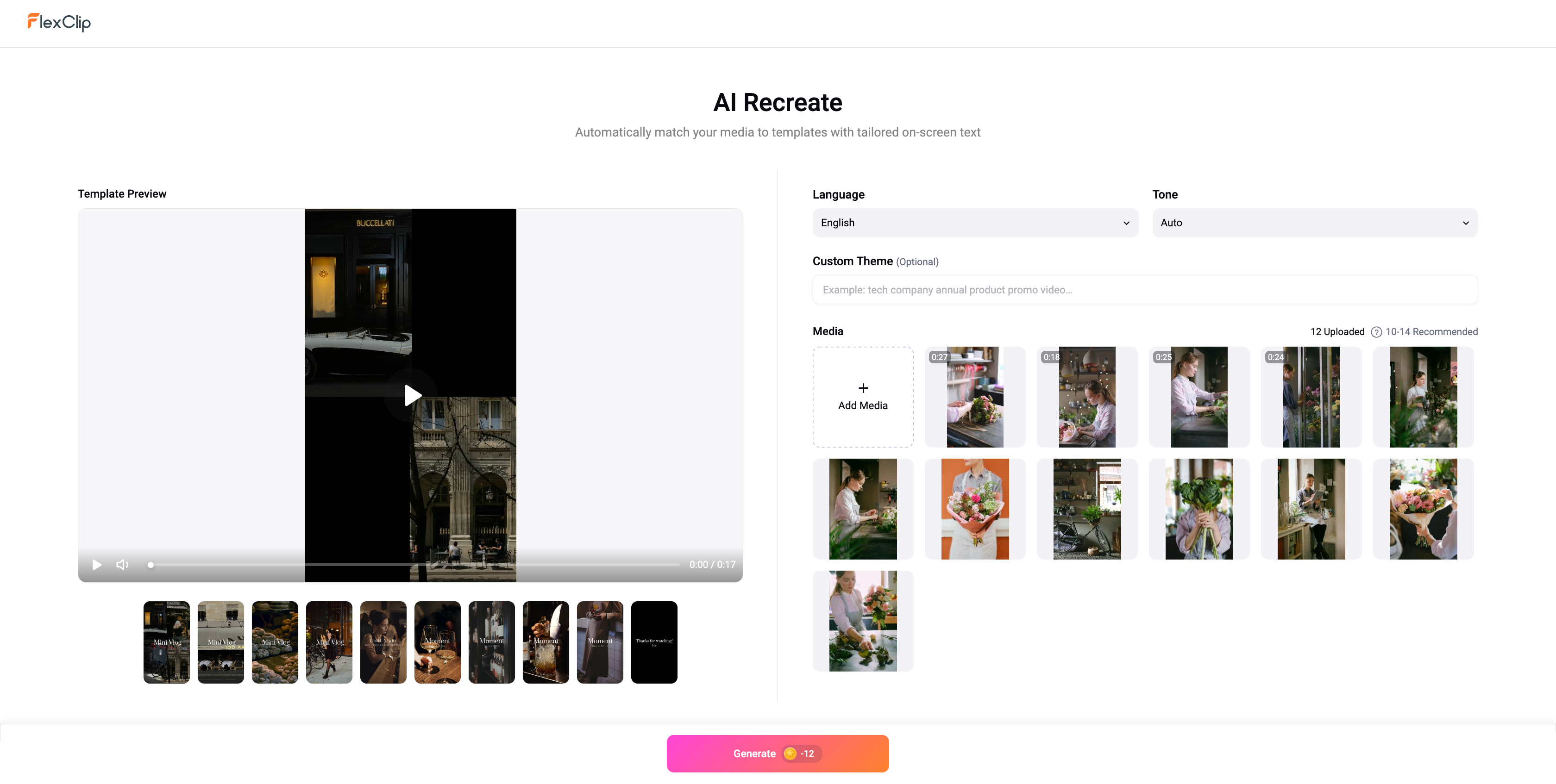 Құралды шынайы жағдайда сынау үшін біз флористің жұмысы туралы қысқаша видео жасауды жөн көрдік. Ол үшін біз гүл шоғын жинау процесін көрсететін барлығы 12 файлдан (фото және видео) тұратын контент қоспасын жинадық. Біз материалдарды FlexClip-тегі алдын ала таңдалған шаблонға жүктедік және бірнеше минуттан кейін қалаған стильдегі дайын видеоға қол жеткіздік.
